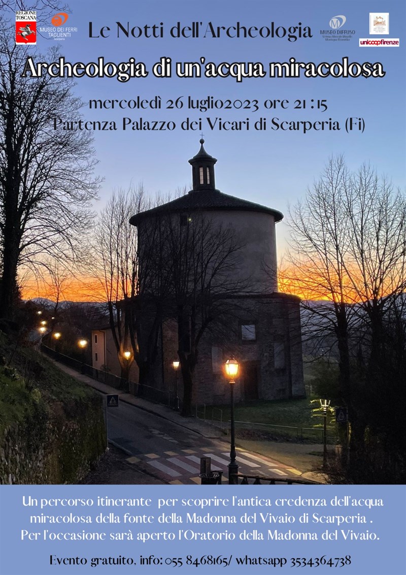 - mercoledì 26, ore 18:30-20:30: Estate in musica (e non solo). Continua la rassegna musicale nell’atrio del palazzo con il concerto del gruppo Audio3, che proporrà pezzi pop-rock degli anni ‘90/2000, nella “golden hour” che farà da cornice agli Aperitivi con vista. Il concerto nell’atrio sarà gratuito, ma se si vorrà abbinare l’aperitivo sui camminamenti allora sarà necessaria la prenotazione ad un costo di € 10,00. Sarà poi possibile intrattenersi ancora, partecipando alle 21:15 alle Notti dell’Archeologia. Da un’iniziativa della Regione Toscana e con la collaborazione di soci Unicoop -Firenze, tornano le notti dell’archeologia con l’evento Archeologia di un’acqua miracolosa -ingresso libero-, in collaborazione con il Comitato Oratorio della Madonna del Vivaio di Scarperia, che sarà aperto in via straordinaria per l’occasione.