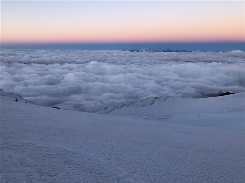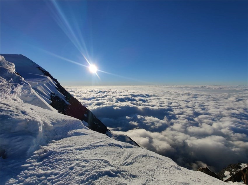 Il programma prevede ora un’altra notte alla Capanna Gnifetti e di risalire nuovamente in quota per realizzare l’ascensione di altre cime di oltre quattromila metri. La mattina seguente tre ragazzi del gruppo decidono di scendere, mentre insieme a Cesare, sentendoci in forma, riprendo il cammino verso l’avventura. Stavolta la nebbia ci avvolge alla partenza, ma appena cinquanta metri sopra il rifugio il cielo è limpido e terso e ci regala un’altra giornata memorabile. Arriviamo fino al colle tra Ludwigshohe e Corno Nero, a oltre 4300 metri, poi scendiamo e saliamo nell’ordine, Balmenhorn (4167 metri), su cui sorge anche il Bivacco Felice Giordano, e Piramide Vincent (4215 metri). Appena sorge il Sole, la nebbia sotto di noi ci consente di assistere ad uno spettacolo che tutti avranno sicuramente visto in qualche foto: il mare di nuvole. Noi siamo sopra, come sospesi. Guardiamo verso l’orizzonte, verso il punto in cui il ghiaccio lascia il posto alle nuvole. “Siamo davvero fortunati” penso. Non ho mai amato i giri di parole, tantomeno i discorsi smielati, ma quando Boris Vian scriveva che “Sulle cime più alte ci si rende conto che la neve, il cielo e l’oro hanno lo stesso valore” beh, probabilmente tutti i torti non li aveva.