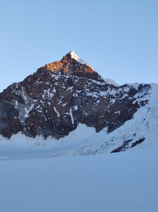 Un tramonto mozzafiato pone fine a questa prima giornata. Personalmente, nonostante la quota, mi sento abbastanza bene: talvolta, infatti, una notte a queste altitudini può significare il fallimento in partenza dei propri progetti se il nostro fisico non riesce ad acclimatarsi adeguatamente. Il giorno successivo la sveglia suona alle 03:50. Una ricca colazione e poi via, ci leghiamo e indossiamo l’attrezzatura alpinistica. Siamo pronti per partire. Fuori un meraviglioso cielo stellato fa da contorno ad un’atmosfera selvaggia e avventuriera. Con gli occhi ancora un po’assonnati ci mettiamo in marcia seguendo la traccia che attraversa inizialmente un bel labirinto fatto di orridi crepacci e di ponti di neve, fortunatamente saldi grazie al rigelo notturno. È indescrivibile la magnificenza dell’ambiente in cui siamo immersi: le aguzze vette che ci circondano, con le loro vertiginose pareti di roccia e ghiaccio si stagliano all’orizzonte quasi a toccare il cielo. Sono momenti e sensazioni che l’unica macchina fotografica che è in grado di immortalare è quella del cuore.