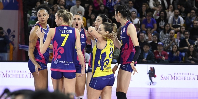 Massimo Barbolini deve fare a meno di Brenda Castillo, fermata ai box per problemi fisici, e schiera un 6+1 con Di Iulio al palleggio, Antropova da opposto, Zhu e Pietrini in banda, Alberti e Washington da centrali e Merlo come libero.